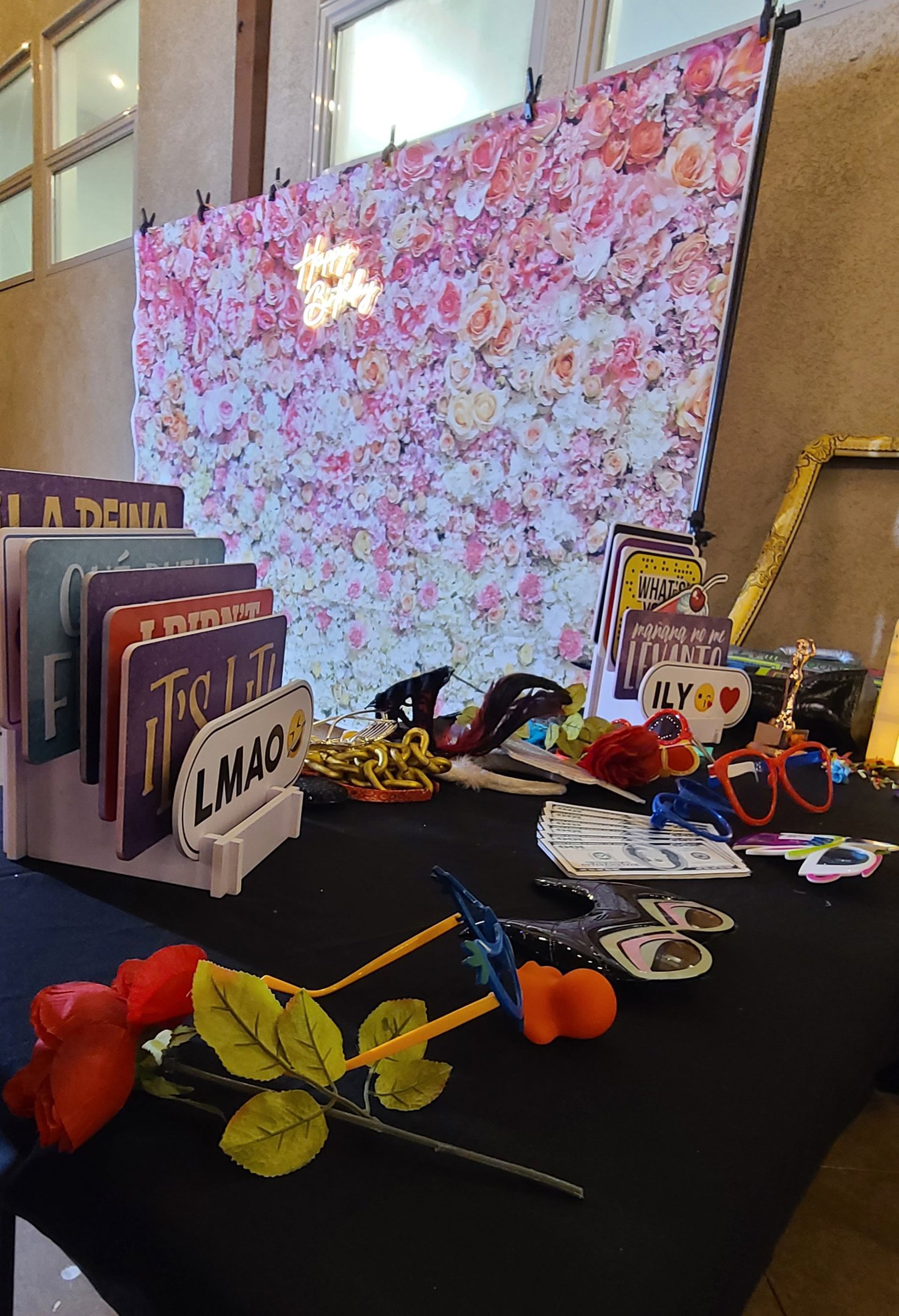We offer a choice of different backdrops that come as part of our packages. The backdrops we provide are made of matte or polyester fabric which allows for glare-free photos. These are provided as a courtesy and do not affect the price of your rental.