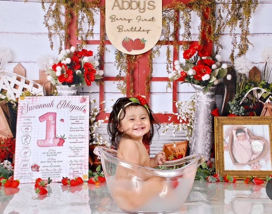 Lastly there is a 15 minutes optional tub session, after your baby is covered with frosting, you'll defiantly need to take them a bath. Your baby will be wearing just diaper or no diaper in a warm tub with the option of having the water clear or whitish (we add a bit of milk). Almost all babies like bath time, this session will be faster than the other ones, we just need the right pose when baby is splashing the water or looking at the camera. So cute!